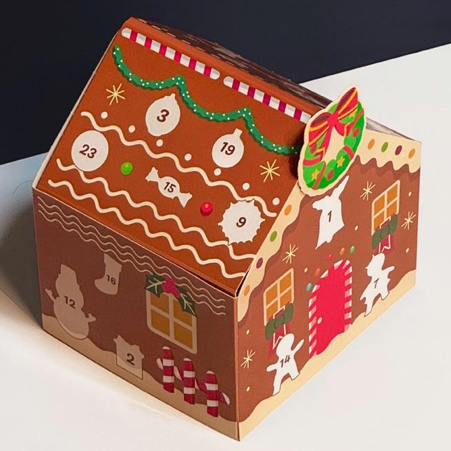 Skladací papierový adventný kalendár s perníkovým domčekom.