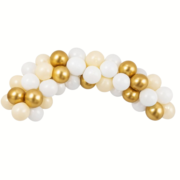 Elegantný balónový veniec v kombinácii bielej a zlatej farby, ktorý ľahko vytvoria aj ľudia bez dekoratérskych znalostí. Skvele sa hodí na svadby, narodeniny, slávnostné oslavy, Silvestra a luxusné večierky.