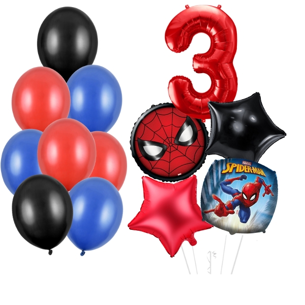 Náš cenovo výhodný párty set s balónikmi obsahuje narodeninovú číslicu 3, 2 fóliové balóniky s motívom Spidemana, 2 fóliové hviezdy a 9 balónikov vo farbe oslavy.