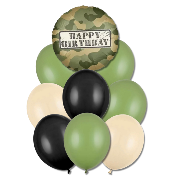 Originálna vojenská balónová kytica inšpirovaná svetom armády a vojakov je ideálnou voľbou pre narodeninovú oslavu malého alebo veľkého fanúšika vojenského štýlu. Farebná kombinácia zelenej, čiernej a maskáčového motívu vytvára autentickú armádnu atmosféru a výraznú dekoráciu na každú oslavu.