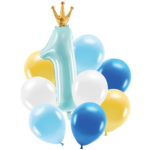 Set latexových balónikov a fóliového balónika číslo 1 so zlatou korunkou tvorí zladený balónový buket a krásnu dekoráciu na oslave 1. narodenín vášho chlapčeka.