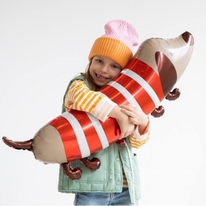 Fóliový balónik je v tvare smiešneho psa v pruhovanom svetri.