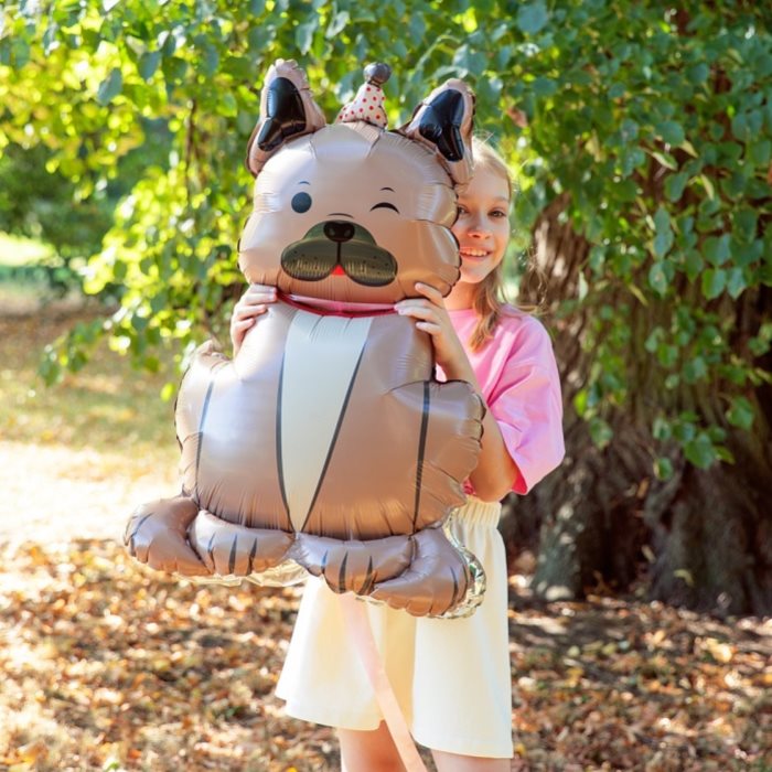 Fóliový balón v tvare buldoga s narodeninovou čiapkou.