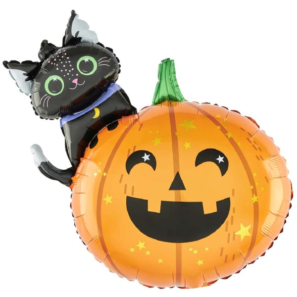 Fóliový balónik v oranžovej a čiernej farbe v tvare tekvice so sladkým mačiatkom.