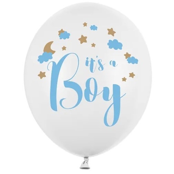 Kvalitný biely latexový balónik s obojstrannou potlačou v modrej a zlatej farbe s nápisom It's a Boy.