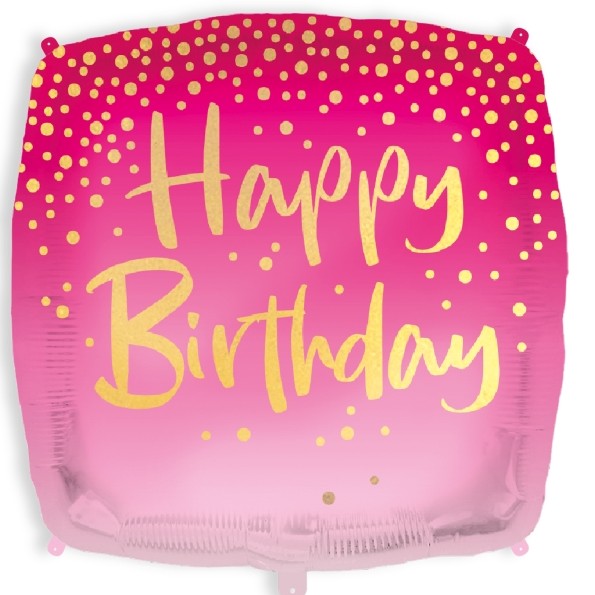 Štvorcový fóliový balón so zlatým Happy Birthday na ružovom ombre pozadí