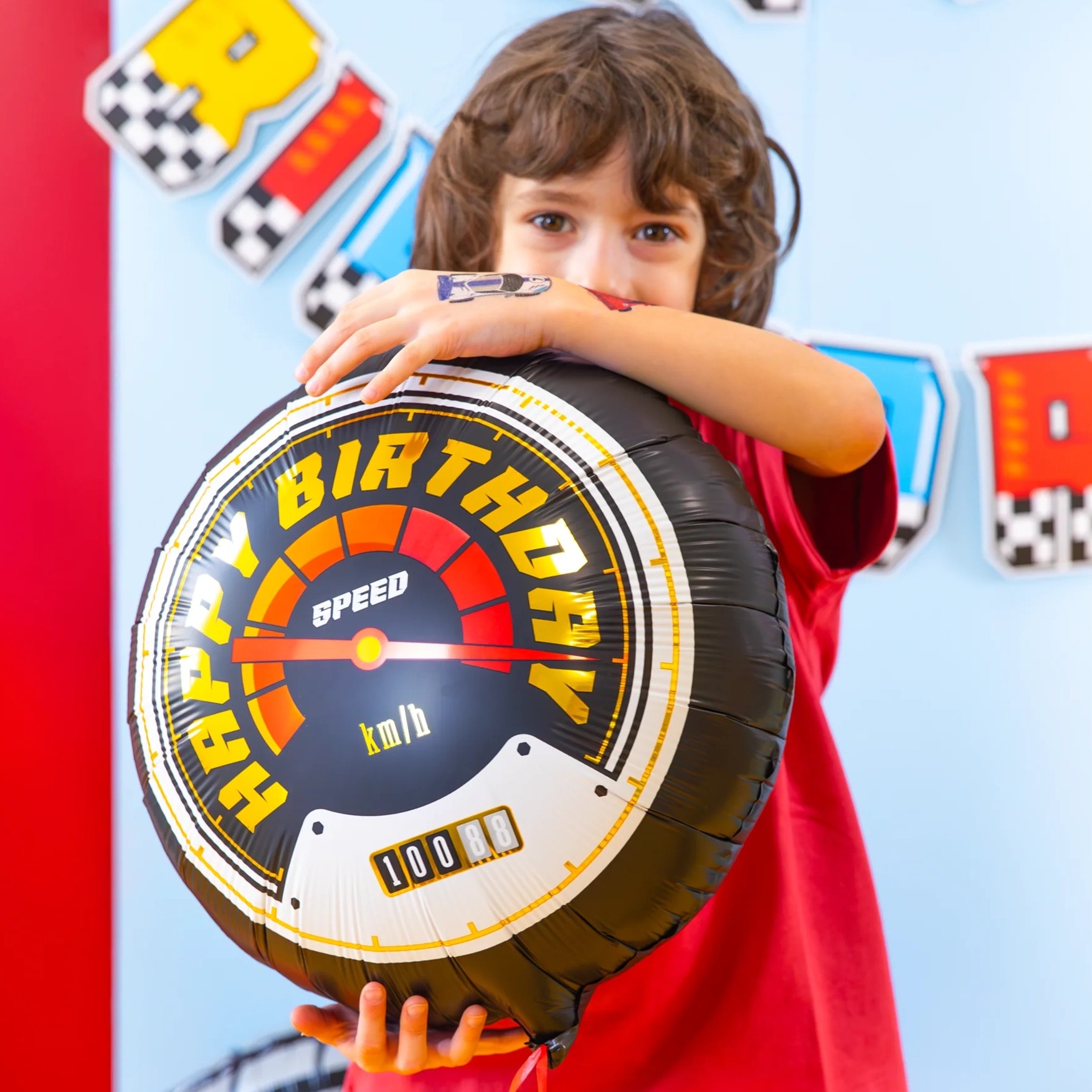 Fóliový balón v tvare tachometra a s nápisom Happy Birthday je výraznou narodeninovou dekoráciou s pretekárskym motívom, ktorá okamžite upúta pozornosť všetkých malých aj veľkých fanúšikov áut a rýchlej jazdy.