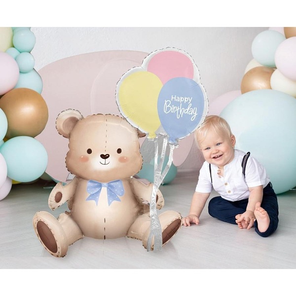 Fóliový balónik v tvare roztomilého svetlohnedého medvedíka s modrou mašľou a balónikmi s nápisom Happy Birthday.