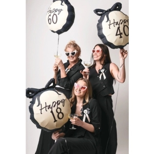 Krémový fóliový balón s čiernou mašľou a nápisom Happy 60