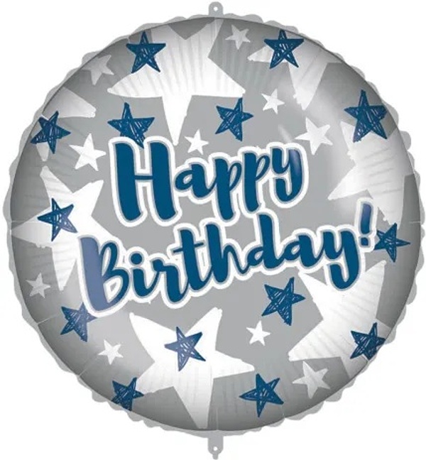 Balónik je strieborný s modrým nápisom a modrými a bielymi hviezdičkami.