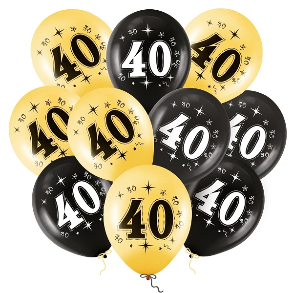 Veľká kytica desiatich čiernobielych a zlatých latexových balónov, každý s potlačou čísla 40.