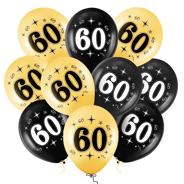 Veľká kytica desiatich čiernobielych a zlatých latexových balónov, každý s potlačou čísla 60.