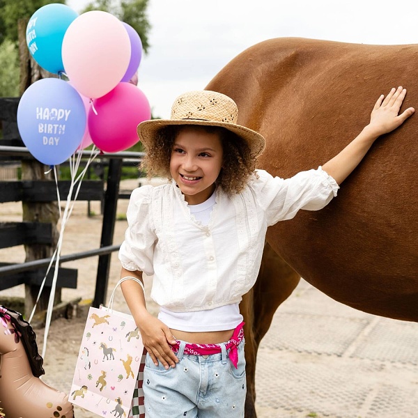 Balenie obsahuje 6 balónov: jeden svetloružový, fuksiový a levanduľový s koníkom a jeden ružový, tyrkysový a fialový s textom "HAPPY BIRTHDAY.