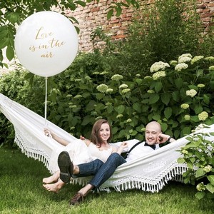 Biely balón obrích rozmerov s nápisom Láska je vo vzduchu je obľúbenou svadobnou dekoráciu, ktorú