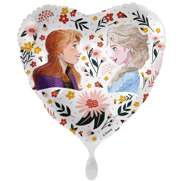 Krásny fóliový balónik v tvare Srdca s princeznami Elsou a Annou s kvetinovým pozadím.