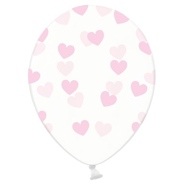 Latexový transparentný balónik s celoplošnou potlačou ružových srdiečok