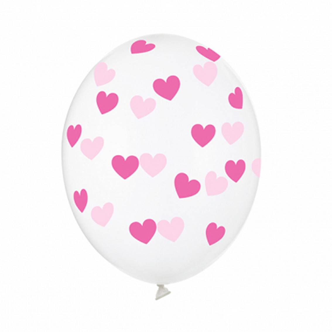 | Latexový transparentný balónik s celoplošnou potlačou tmavo ružových srdiečok vhodné pre nafukovanie vzduchom aj … |