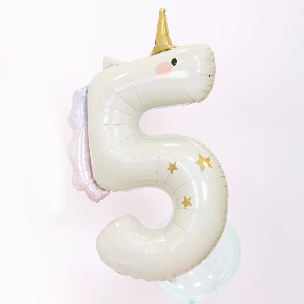 Urobte oslavu 5. narodenín svojho dieťaťa ešte výnimočnejšou s týmto krémovým holografickým fóliovým balónikom s motívom jednorožca a v tvare čísla 5.