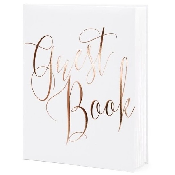 Je vhodná na odkazy a priania od svadobčanov. Kniha hostí v bielej farbe s nápisom vo farbe ružového zlata