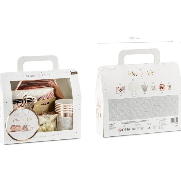 Sada obsahuje: 1ks banner Miss to Mrs vo farbe ružového zlata, v rovnakom odtieni 6ks papierových
