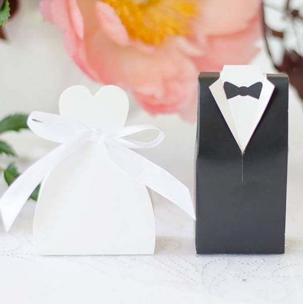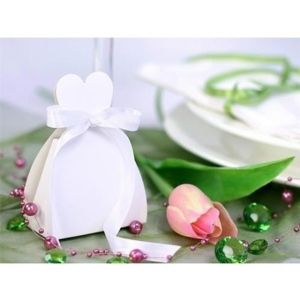 Darčekové krabičky v bielej farbe v tvare nevesty s mašľou a srdiečkom.
