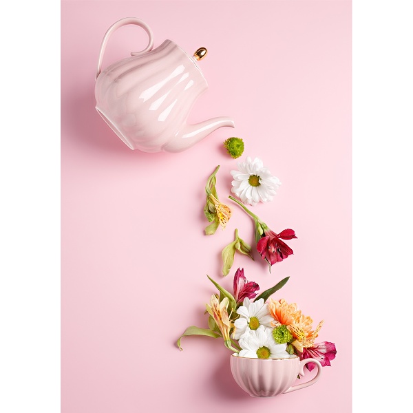 Blahoprianie v ružovej farbe s čajníkom, šálkou a kvetmi