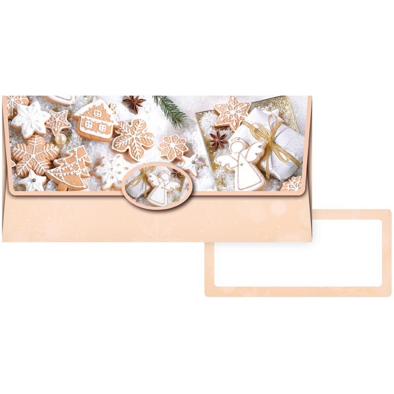 Darčeková obálka na peniaze s vianočným motívom perníkových domčekov a uzatváraním na chlopňu.