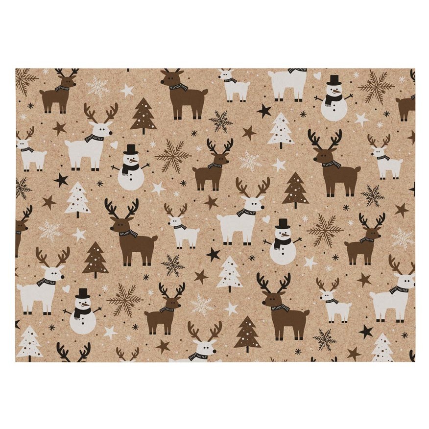 Vianočný kraftový baliaci papier s motívom vianočných stromčekov, sobov a snehových vločiek.