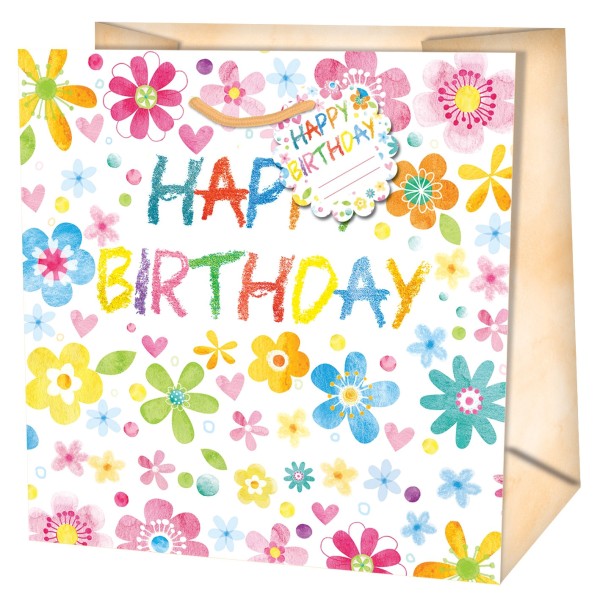 Darčeková taška je štvorcová s atraktívnou potlačou pastelových kvetov a nápisom Happy Birthday.