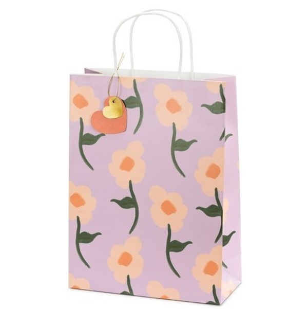 | Darčeková taška Kvety vo fialkovej farbe s farebnou potlačou a 2 visačkami v tvare srdiečok Originálna darčeková taštička … |