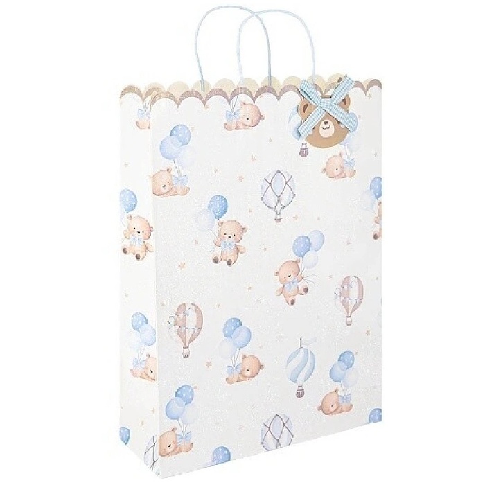 Darčeková taška veľká s medvedíkmi v svetlomodrej farbe je praktickým a zároveň veľmi roztomilým riešením na balenie väčších darčekov.