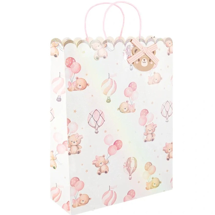 Darčeková taška veľká s medvedíkmi v svetloružovej farbe je praktickým a zároveň veľmi roztomilým riešením na balenie väčších darčekov.