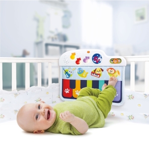 - Mäkké hračkárske piano do postieľky, ktoré motivuje deti k pohybu nôh. Môžete ho použiť aj pri hraní na brušku alebo pri sedení. Piano vydáva 4 zvuky nástrojov, zvuky zvieratiek a má blikajúce svetlá. K dispozícii sú 3 režimy: noty, melódie, improvizácia so zvieratkami. Ľahko sa pripevňuje k postieľke. Piano vyžaduje 2× AAA batérie, sú súčasťou balenia.