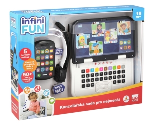 - Prvá realistická domáca kancelária! Sada obsahuje detský počítač, slúchadlá a telefón. Počítač obsahuje 5 herných režimov - objavovanie, písmená, čísla, farby a hru "buď ako" Počítač má zvukový režim v CZ/SK verzii, telefón má zvukové efekty a prehráva hudbu; slúchadlá sú bez elektronickej funkcie.