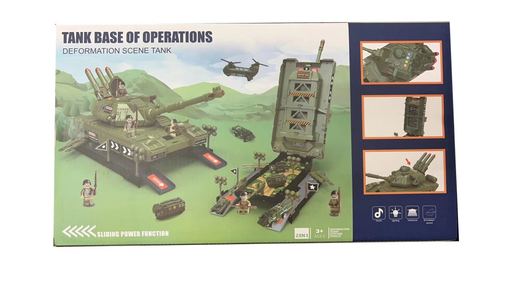 - Hracia súprava v tvare tanku. Svetelné a zvukové efekty. Súprava obsahuje 4 kovové vojenské autá a príslušenstvo.