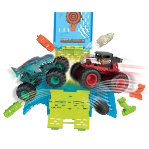 - Hot Wheels® Monster Trucks 1:24 Mega Wrex s klietkou sa otvorí a odhalí diabolské herné prostredie so skokanskými rampami, terčmi a autíčkom Mega Wrex™ v mierke 1:24. Súčasťou sú aj 3 rozdrvené autíčka a pneumatika, ktoré sa zmestia do klietky na pohodlné uskladnenie.