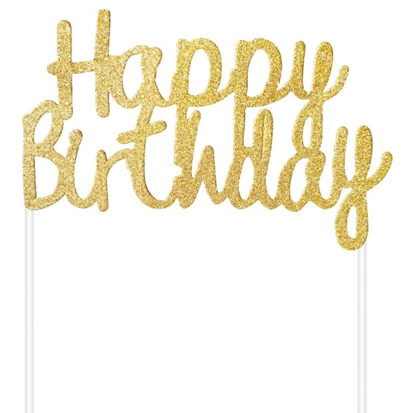 Zápich do dortu s nápisem Happy Birthday ve zlaté barvě je jednoduchý a rychlý způsob, jak elegantně ozdobit jakýkoliv narozeninový dort.
