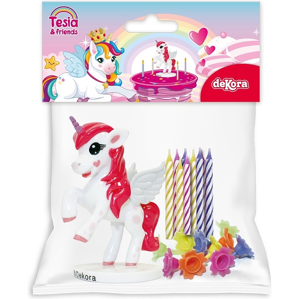Figúrka na tortu Jednorožec meria 8,5 cm a je doplnená 10 žiarivými sviečkami.