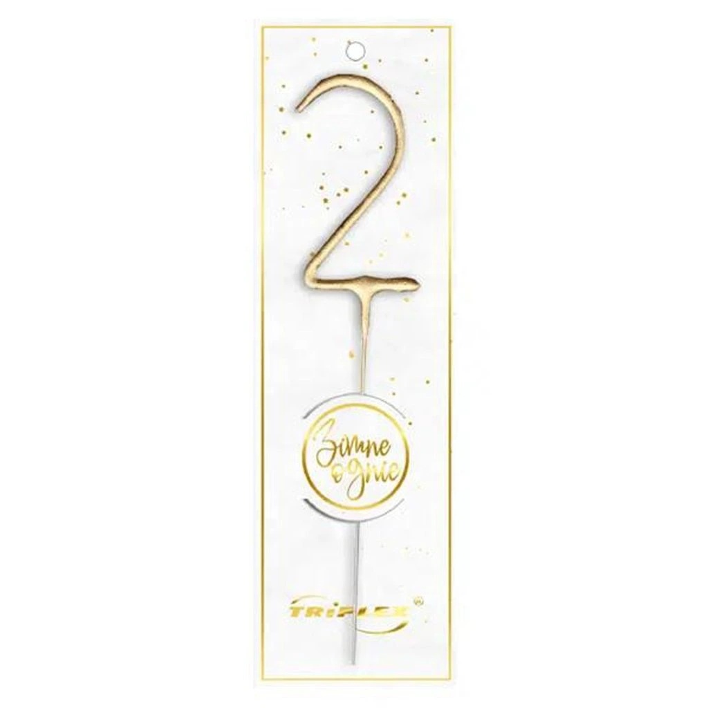 Zlatá prskavka v tvare čísla "2" je vhodná na slávnostné chvíle, ako sú narodeniny, detské oslavy alebo tematické párty.