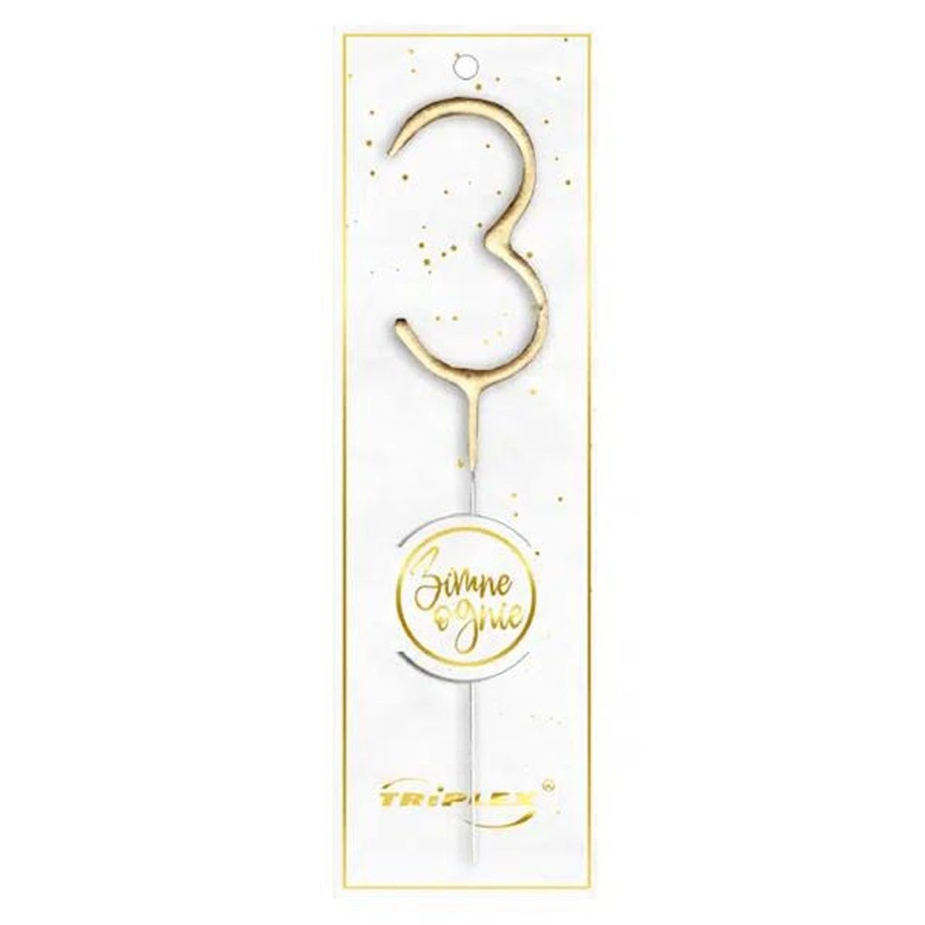 Zlatá prskavka v tvare čísla "3" je vhodná na slávnostné chvíle, ako sú narodeniny, detské oslavy alebo tematické párty.