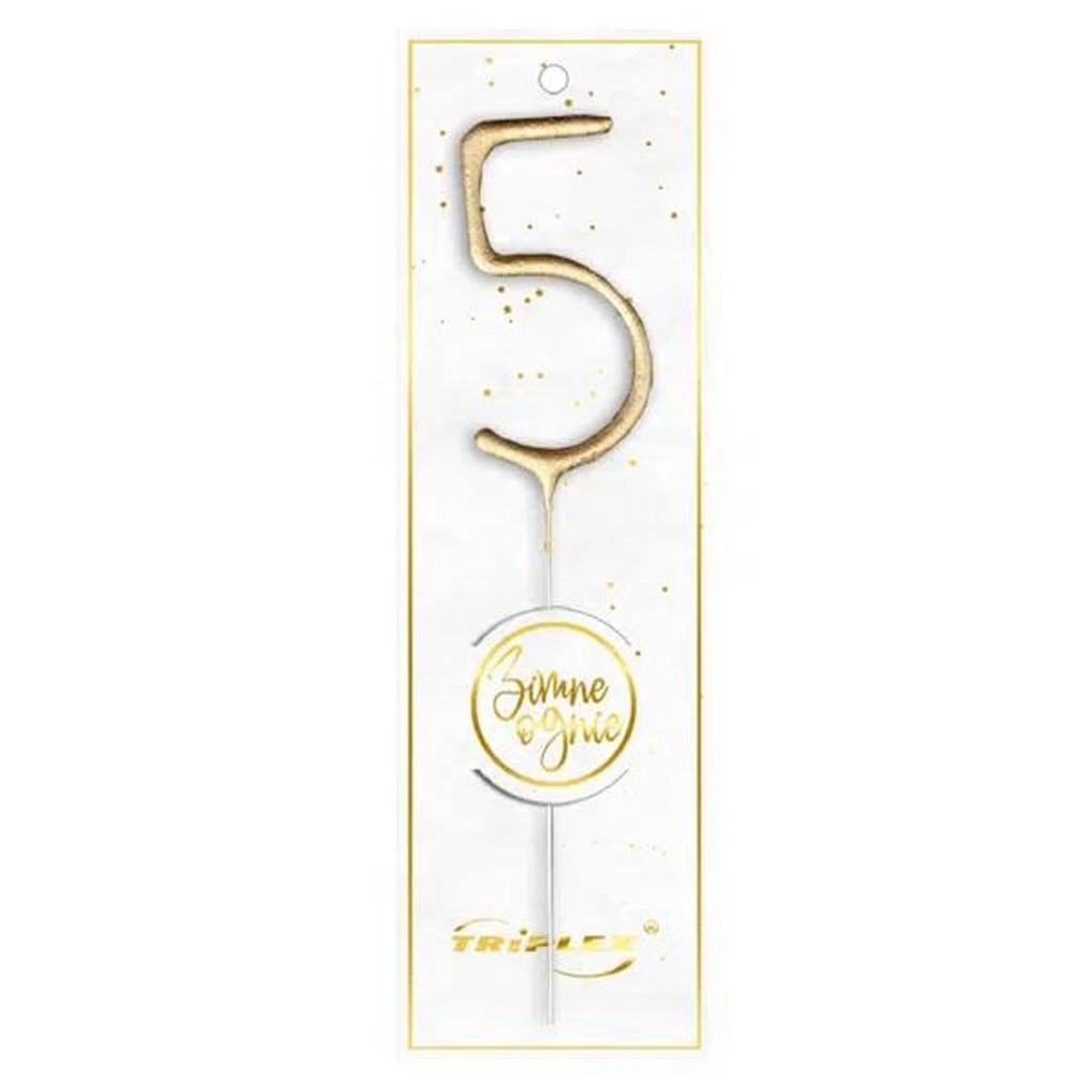 Zlatá prskavka v tvare čísla "5" je vhodná na slávnostné chvíle, ako sú narodeniny, detské oslavy alebo tematické párty.