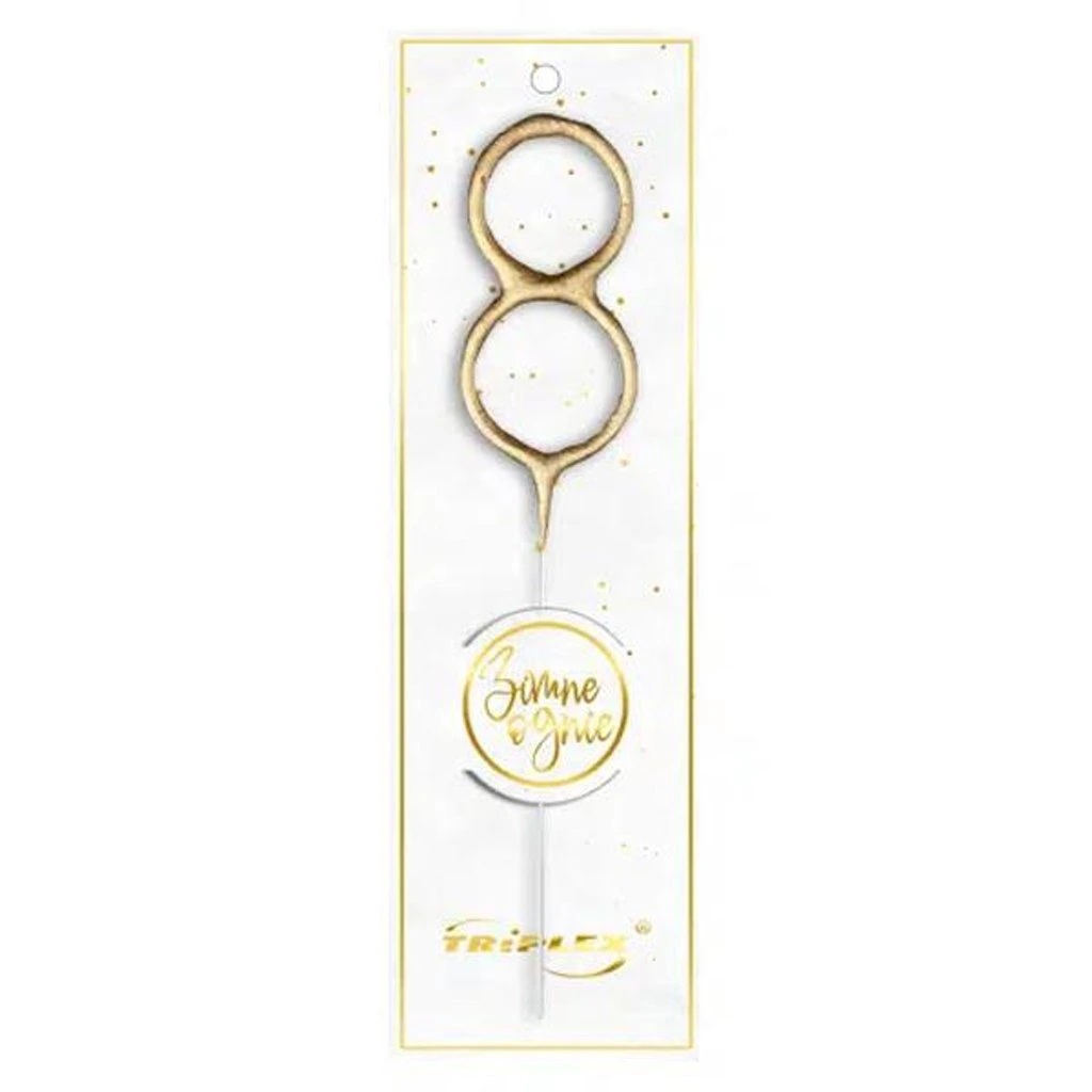 Zlatá prskavka v tvare čísla "8" je vhodná na slávnostné chvíle, ako sú narodeniny, detské oslavy alebo tematické párty.