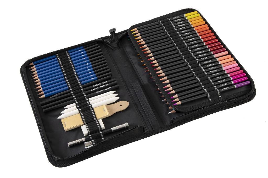 Súprava na maľovanie a skicovanie - obsahuje 96 kusov potrieb na maľovanie a skicovanie (pastelky, ceruzky, orezávátko, škrabky atď.) v praktickom balení na zips.
