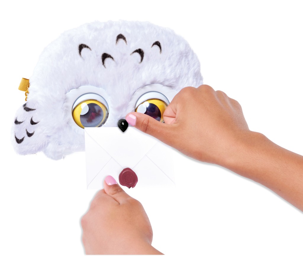 - Interaktívna kabelka Hedviga v podobe zasneženej sovy zo sveta Harryho Pottera má veľké zlaté blikajúce oči, ktoré reagujú na dotykový senzor. Pomocou ďalších dotykov aktivujte viac ako 30 rôznych zvukov a reakcií. Je vyrobená z mäkkého škvrnitého plyšu s množstvom krásnych módnych detailov. Vhodné pre deti od 6 rokov.