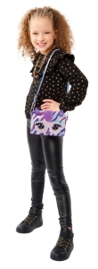 - Interaktívna kabelka Zebra má veľké blikajúce oči, ktoré reagujú na dotykový senzor. Pomocou ďalších dotykov môžete aktivovať až 30 rôznych zvukov a reakcií. Je vyrobená z lesklej striebornej lakovanej látky so striedajúcimi sa fialovými pruhmi, má nadýchanú hrivu, kovové doplnky a nastaviteľný popruh. Rozmery 11 × 16 × 6,5 cm. Vhodné od 5 rokov.