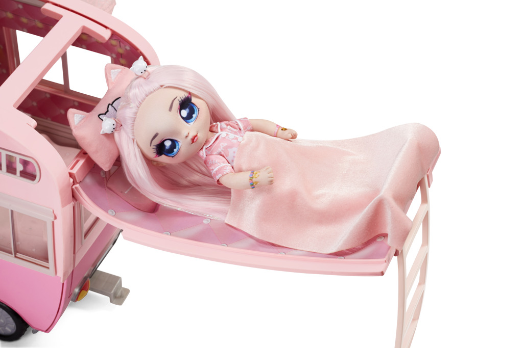 - "Tu! Na! Na! Prekvapenie Bábiky a tínedžeri môžu vyraziť na cestu v útulnom pohyblivom ružovom karavane s mačacími detailmi. Vysuňte horný, predný a bočné panely a karavan sa rozloží na 7 hracích priestorov, ako je kuchyňa s mikrovlnnou rúrou a rúrou, hojdacia sieť, posteľ, stolička, sprcha, šatník a ďalšie. Karavan má funkčné okná, zásuvky a veľa mäkkého nábytku s mačacími detailmi. Karavan môžete zapojiť do siete Na! Na! Na! Štýlový kabriolet.