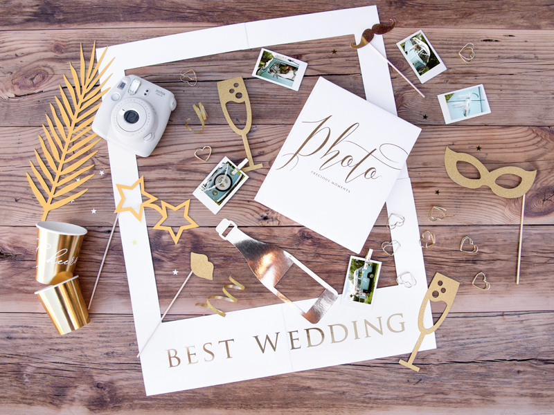 1x biely rám s nápisom Best Wedding 50 x 59,5 cm, 8 doplnkov pre fotografovanie na špajli so zlatými motívmi 21-42 cm, 3ks transparentných latexových balónikov so zlatými srdiečkami o veľkosti 30cm a 3m zlatého povrázku.