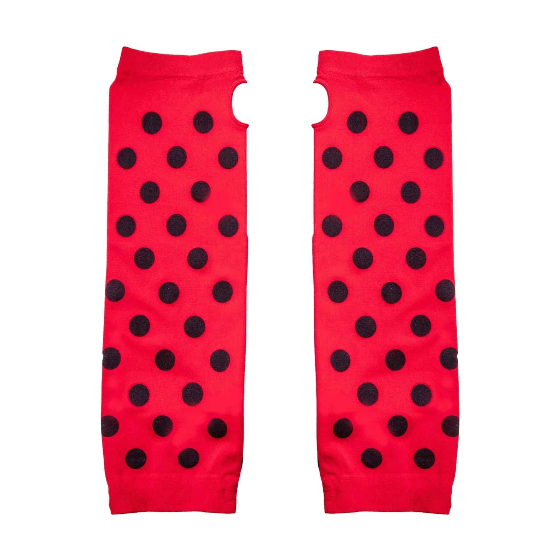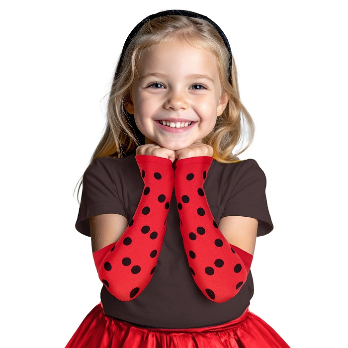 | Detské dlhé rukavice bez prstov v červenej farbe s čiernymi bodkami Červené párty rukavice s čiernymi bodkami sú výrazným … |