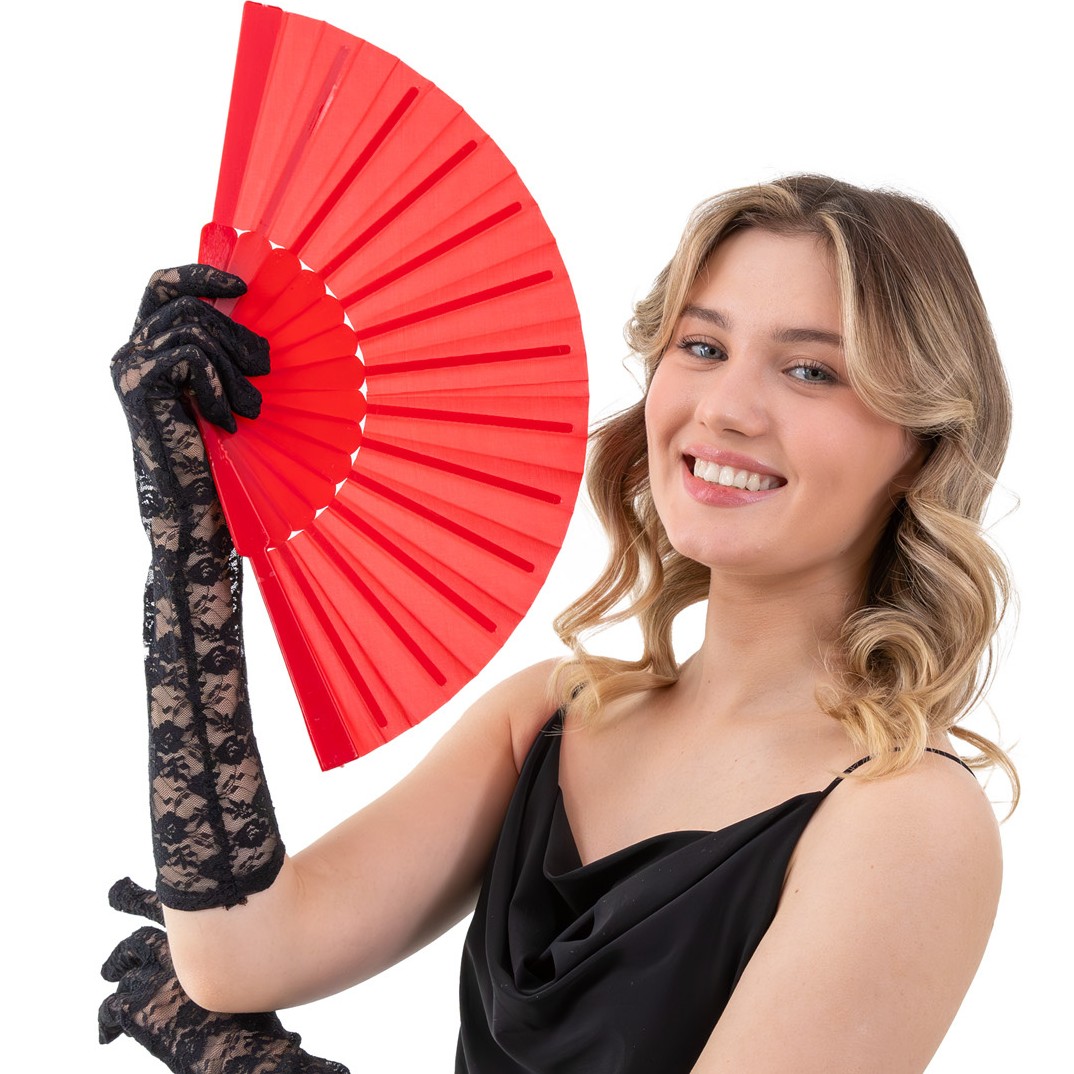 Tento štýlový červený vejár je elegantným doplnkom kostýmov, divadelných predstavení, fotení a letných outfitov.