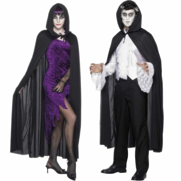 Plášť čiernej farby s kapucňou a zaväzovaním pod krkom je dôležitý doplnok kostýmu pre každého upíra, čarodejnice,